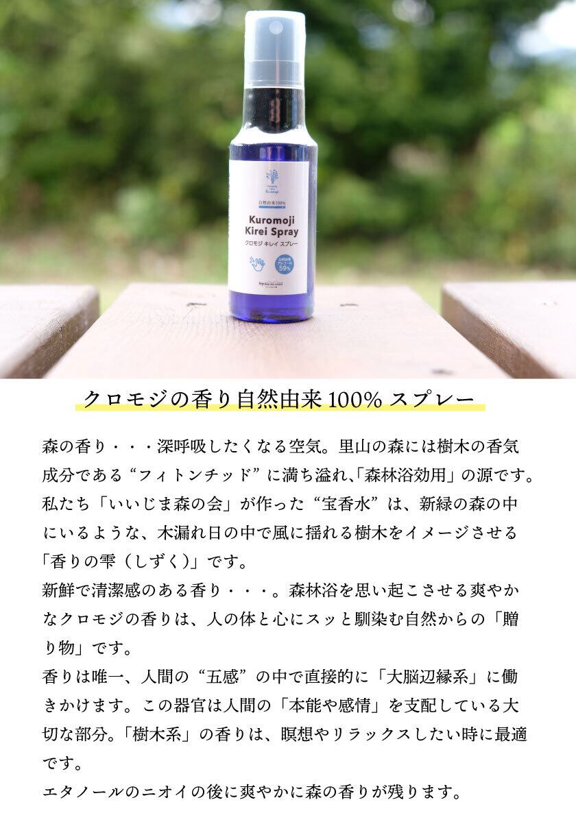 南信州産の「クロモジキレイスプレー」は、どこでも感じる「森の静けさと清潔感」を持ち運べるコンパクトな商品です。毎日のひと吹きで、癒しと安心を感じて下さい。